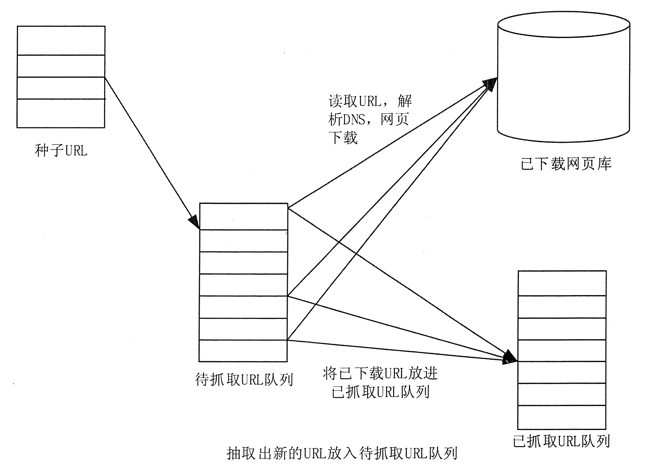 网络爬虫系统首先将种子 URL 放入下载队列,并简单地从队首取出一个 URL 下载其对应的网页,得到网页的内容并将其存储后,经过解析网页中的链接信息可以得到一些新的 URL。