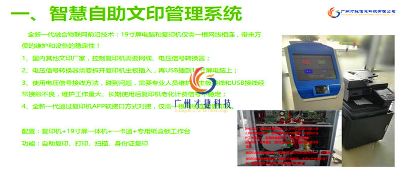 自助文印系统通过一卡通身份认证、利用学校原有的校园网络、通过对复印机系统的集成真正做到无人化自助复印、打印、扫描,并做到使用人、使用时间、使用内容、使用费用变的可控可查