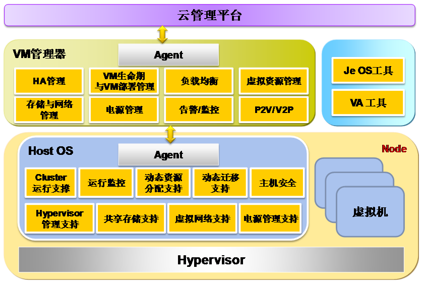 Hypervisor组件一起为虚拟机管理提供支持。主要功能有为虚拟机提供网络、块设备I/O支持;辅助云弹性计算系统管理工具实现对Hypervisor、虚拟机的控制、监控等功能,如:虚拟机启动、停止、迁移等。