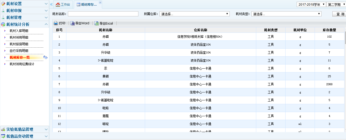 3. 耗材查询,可按耗材入库、领用、报废、库存、自行采购等查询统计以及耗材经费情况统计查询耗材情况。